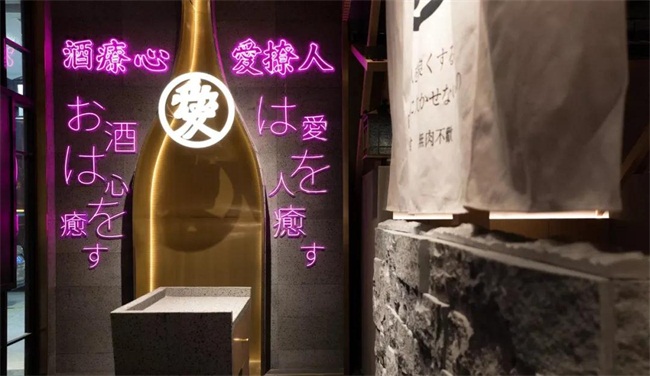 店門口的霓虹燈武士像和墻上掛著的“愛”字標識都突顯日本武士道精神。