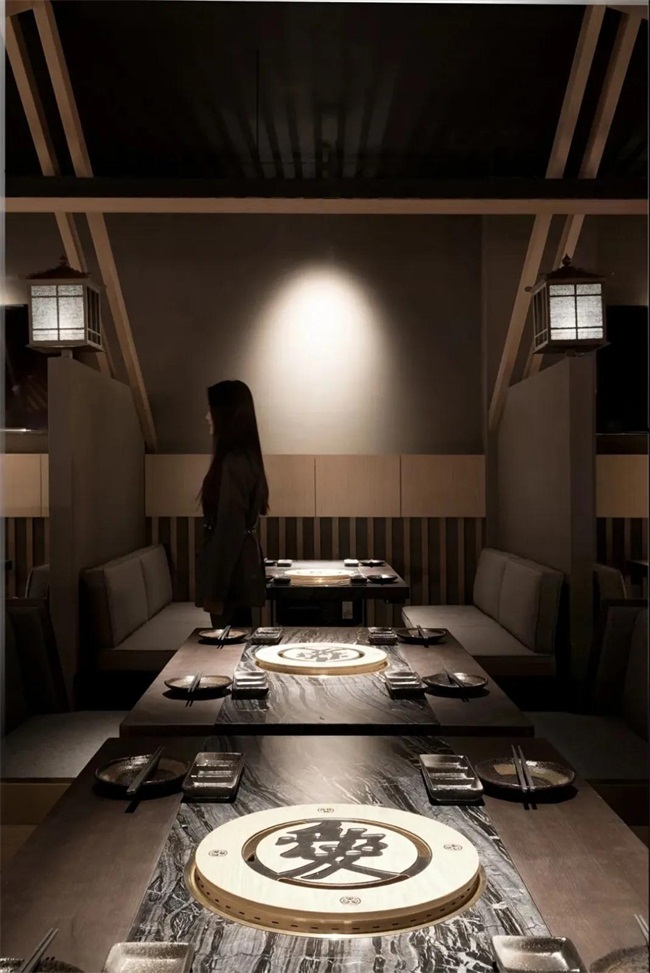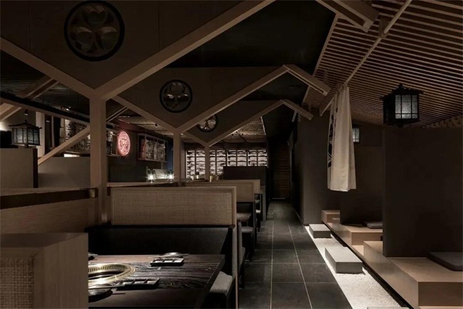 愛燒肉居酒屋設計理念還原了日本狹窄擁擠的街道形象,餐廳的入口設計為三角形的坡屋頂,意圖用強烈的三角形房頂來表達日式建筑 。