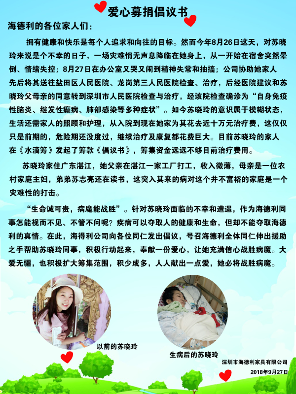 “生命誠可貴,病魔能戰勝”。海德利公司是一家團結友愛、互相幫助的大家庭,針對蘇曉玲的不幸和遭遇,作為海德利家人怎能袖手旁觀呢?疾病可以奪取人的健康和生命,但卻不能奪取海德利的真情。在此,海得利公司谷先生在公司中層干部會議、早會上發起為患病蘇曉玲同事獻愛心、送幫助募捐倡議,號召海德利公司全體員工伸出援助之手幫助蘇曉玲,積極行動起來,奉獻一份愛心,讓她充滿信心戰勝病魔。于10月7日至8日公司谷先生、左先生到各車間用海德利的核心價值觀“感恩”來引導工員工的行為,從公司領導班子到部門經理、車間主管到普通員工等47人都能踴躍捐款慷慨解囊,為蘇曉玲合計捐款15000元,獻出了自己的愛心。10月10日公司委派佐忠全和吳然馳到廣東廣州市三九腦科醫院代表海德利公司和47員工看望蘇曉玲,同時將15000元募捐款也送到蘇曉玲的手中,并希望蘇曉玲安心養病,早日恢復健康。