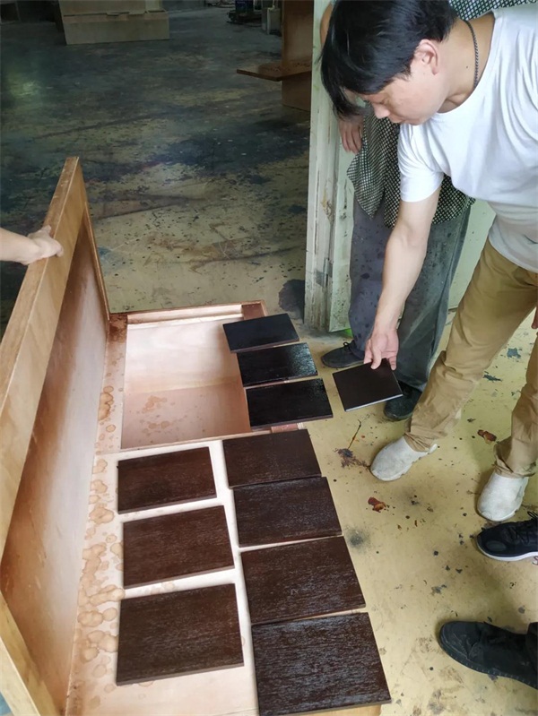 反復丈量樣品尺寸,反復對比設計圖,從尺寸、功能,到顏色,嚴格按照圖紙設計、生產。設計師與生產車間的師傅反復溝通確認,精準把控矩形展柜的尺寸,不能太高,拿放不方便,影響使用效率,但若太矮,又失去了高端大氣之感。他說,失之毫厘謬以千里,所以1毫米都不能放過。