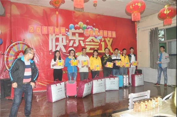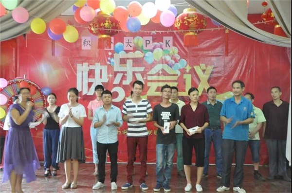 圖為快樂會議現場,公司為積分靠前員工頒發物質獎勵和榮譽獎狀
