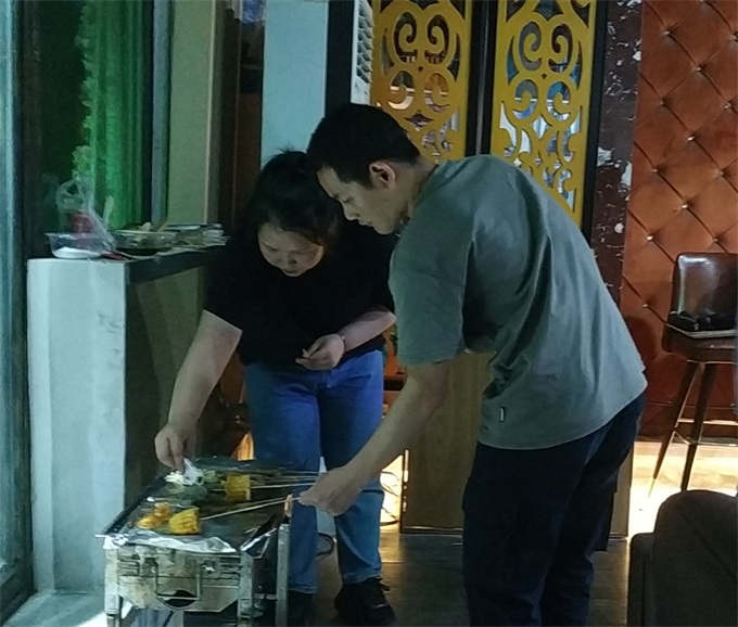 接到任務,我開始馬不停蹄的策劃及部署,聯系推廣部準備投影儀及制作創意背景,利用美團跑腿購買蔬菜及燒烤配料,考慮到我們不是專業燒烤師,不擅長烤肉類食物,便向谷先生請示去燒烤店烤肉類,我們自己烤素食,谷先生非常贊成!廚房師傅給我們提供了燒烤工具,我們小伙伴就開始一起洗菜、串菜,做的有模有樣!在串菜的同時,姜小姐也來到了我們公司。