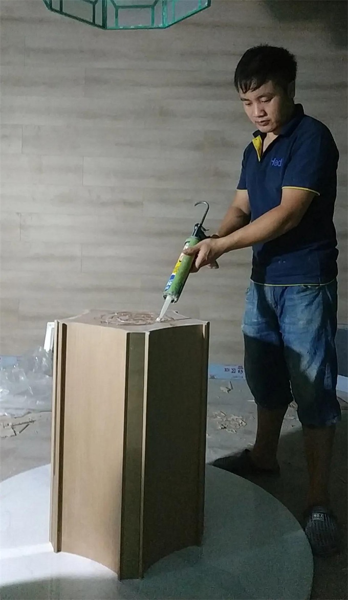 圖:不銹鋼片與水曲柳飾面板混搭做成的異形桌子底座