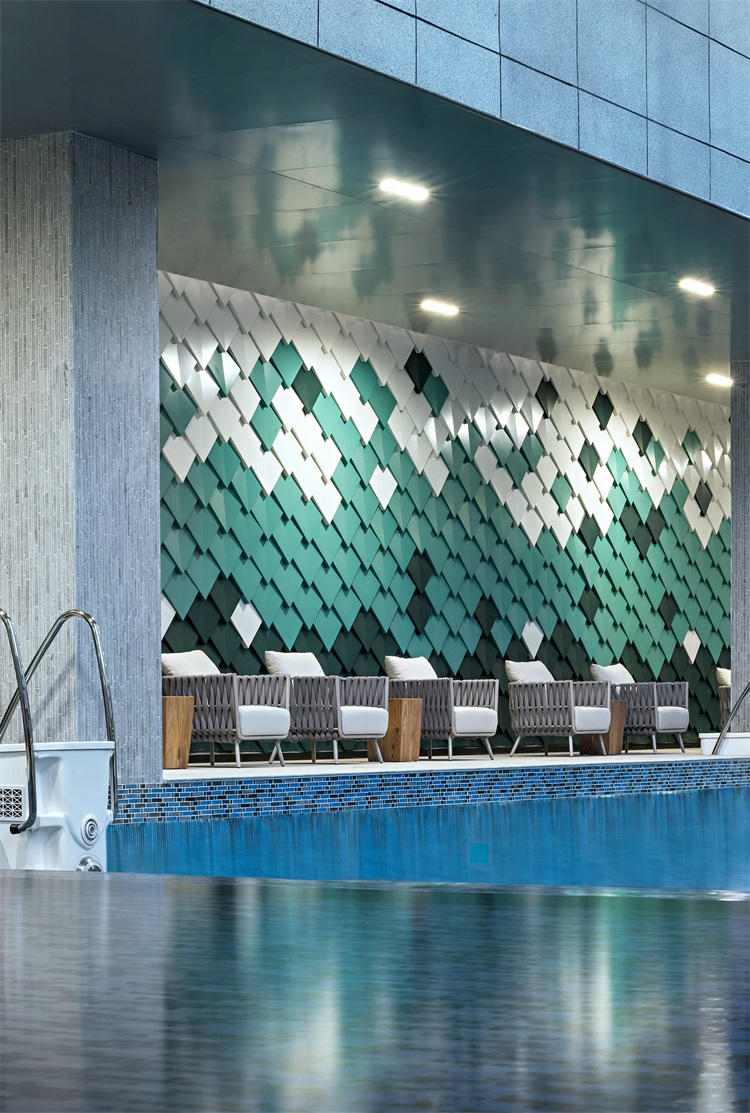 會所內并設置多樣配套空間:如多功能廚房及娛樂房,提供小型派對或廚藝體驗班。休閑咖啡區旁附設戶外露天泳池,幾何立體造型墻抽象地表現山勢之美,色調上同樣采用孔雀綠,漸變出頗具意味的幾何畫像。駐足于此,人們油然而生藝術思考之感,在城市繁忙節奏之外尋獲生活的平衡。