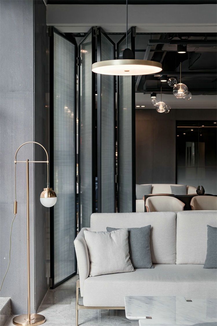 深圳 : 依山傍海的國際化都市,設計師將該市之自然與人文印象提煉為設計元素并融入整體空間。從服務吧臺造型由不同的盒子迭加,至鋁條吊頂亦縱橫亦傾斜的非常規排列,呼應地面半圓形的水磨石區域,抽象且具體地表現出高低錯落、路線連網的城市印象。