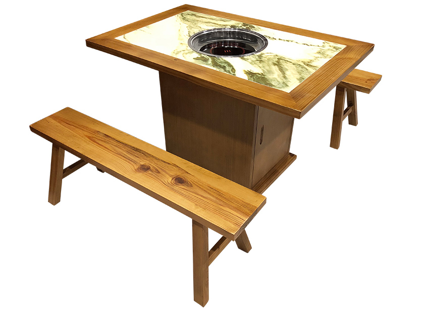 實木邊框鑲嵌火燒石桌面升降無煙火鍋桌